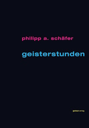 Philipp A. Schäfer, der die Tour „Graffiti & Streetart in Frankfurt – eine junge Geschichte der Kunst“ leitet, unternimmt mit „Geisterstunden“ ein Experiment: Er zeigt einen Querschnitt durch 25 Jahre seines künstlerisches Schaffens im öffentlichen Raum und anderswo, verbunden mit aktueller Lyrik, die zum Teil eigens für diesen Band, als Reaktion auf ein bestimmtes Bild, entstanden ist. Die Geister, im Frankfurter Volksmund City Ghosts genannt, entstanden ab 1999 und ziehen sich bis heute durch das Werk von Philipp A. Schäfer. Das Buch vereint Graffiti-Kunst und Streetart auf der einen Seite und lyrische Texte und ihre typografische Gestaltung auf der anderen.